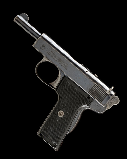 for 1914, with semi-exposed 5in. barrel, crescent fore-sight, blued slide marked 'WEBLEY & SCOTT LTD LONDON & BIRMINGHAM 9m/m AUTOMATIC PISTOL' along with the 'winged bullet' trademark, top ejection, push-button slide release, adjustable rear-sight, blued frame, polished exposed hammer, grip safety to the back-strap, black chequered hard-rubber grip to the left hand side, right hand side missing but grip screw present, polished trigger-guard, heel magazine release and blued lanyard ring, the whole retaining nearly all its original finish, missing magazine