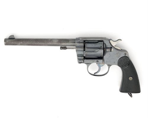 for 1907, with scarcer 7 1/2in. barrel signed and with patent dates to June 5th 1900, fixed sights, blued fluted swing-out cylinder, blued frame, the side-plate stamped 'COLT'S NEW SERVICE' in a circle around the rampant stallion trademark, polished sides to the hammer, 'COLT' embossed chequered hard rubber grips (small losses along one edge) and lanyard ring at heel, strong traces of original finish