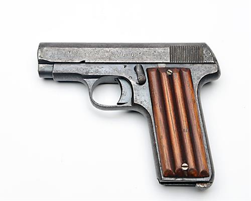 A .32 ACP (7.65mm) SEMI AUTOMATIC PISTOL SIGNED UNION, serial no. 161, French circa 1930, with 3in. barrel, ribbed slide with sighting groove, iron frame, replacement wood grips, missing magazine