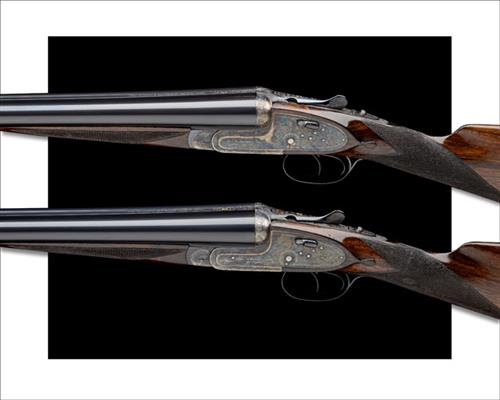 26in. nitro chopperlump barrels, ribs gold-inlaid '1' and '2', 2 3/4in. chambers, bored approx. 1/4 and 1/2 choke, engraved arcaded fences, toplevers gold-inlaid '1' and '2', manual safeties, removable striker discs, hand-detachable lockplates, gold-inlaid cocking-indicators, articulated front triggers, rolled-edge triggerguards, acanthus scroll engraving, 14in. stocks, weight 6lb. 8oz.