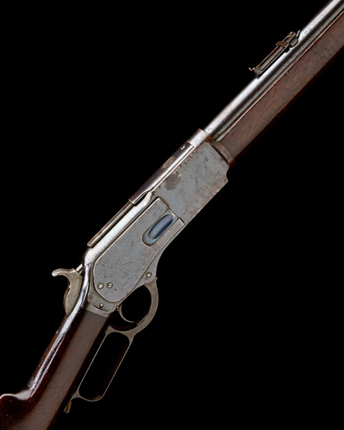 for 1879, with 28in. blued barrel signed 'WINCHESTER'S REPEATING ARMS. NEW HAVEN. CT.' with King's Improvement patent dates and signed 'WATSON. 4. PALL MALL. LONDON.', blade fore-sight, rear-sight calibrated to 1,000 yards and marked '1876', blued action with sliding dust-cover, hammer and lever each retaining some faint original case-hardened finish, walnut straight-hand butt-stock with crescent heel-plate and sliding trap-cover containing a Winchester four-piece cleaning rod, blued full-length tubular magazine, the whole retaining a fair amount of original blued finish.