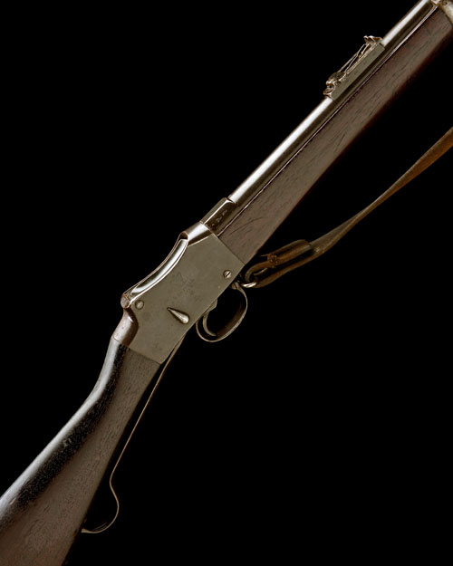 dated for 1887, with 33in. barrel, ramp fore-sight, elevating ladder rear-sight, plain receiver dated and stamped with a 'VR' crown device and the model number, tear-drop cocking indicator, stepped back to the action, walnut butt-stock with iron heel-plate, long cocking lever, walnut three-quarter length fore-end, two iron barrel-bands, the front with bayonet lug, iron nose-cap and iron under-barrel clearing rod, fitted with a period leather sling