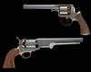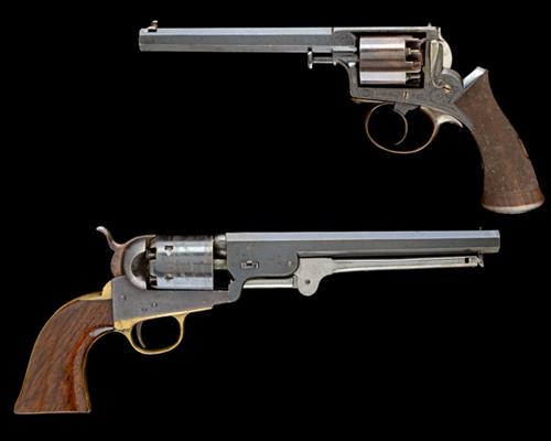 circa 1855, the first in imitation of a Colt 1851 Navy, with blued octagonal 7 1/2in. barrel signed 'COLT BREVETE', plain blued cylinder with roll-engraved scene, blued open iron frame, brass trigger-guard and grip-straps, smooth walnut one-piece grip and brushed bright articulated loading lever, the second in imitation of an 1851 pattern Adams, with blued octagonal 6in. barrel, the top-strap and flat signed 'MANUFD. BY C. DANDOY, LICENCED BY DEANE ADAMS & DEANE LONDON', plain five-shot cylinder, borderline and scroll engraved solid frame, spurless hammer, chequered walnut one-piece grip with cap-box to heel, no provision for loading lever, both pistols in fine condition with much original finish remaining; TOGETHER WITH a period mahogany case compartmented and lined in green baize in the Continental fashion containing the pistols and a host of accessories including a flask, two brass bullet moulds, two turn-screws, a loading convertible mallet cleaning rod, an oil bottle, wad-punch and two nipple keys