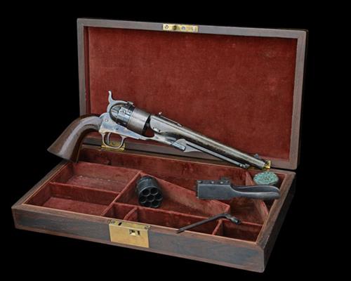 originally manufactured in 1869 and converted at a similar time, with round 8in. barrel signed 'ADDRESS COL SAML COLT', the remainder obscured beneath a barrel mounted adjustable buckhorn style sight appearing factory fitted, blade fore-sight, stepped front-loading cylinder with roll engraved scene, Thuer patent turning ring to rear of cylinder positionable for unloading or firing, colour-hardened open frame marked 'COLTS PATENT', colour-hardened hammer, blued iron back-strap with brass front-strap and trigger-guard, smooth walnut one-piece grip and articulated under-barrel loading lever, bluing to the barrel re-touched but retaining much colour and finish; TOGETHER WITH its mahogany brass cornered storage case, compartmented and lined in dark red velvet and containing a percussion cylinder (appearing unused), an 'L' shaped nipple-key, a cap-tin and a steel Colt's Patent double cavity mould, all remaining in fine condition