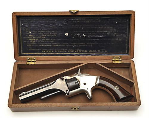 A SCARCE BOXED .22 (SHORT) SEVEN-SHOT REVOLVER SIGNED SMITH & WESSON, MODEL '1', serial no. 23493, second issue, with blued octagonal 3 1/8in. barrel, blued plain cylinder, nickel-plated frame and smooth rosewood grips, TOGETHER WITH its manufacturer's wood box with rounded corners, the interior compartmented for the revolver with blue instruction label to inside of lid (label worn)
