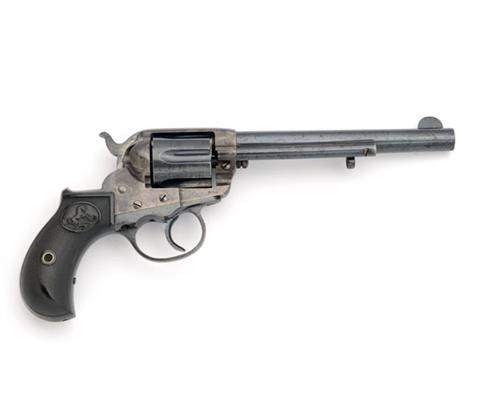 for 1898, with tapering blued 6in. barrel, the top signed 'COLT'S PT. F.A. MFG CO. HARTFORD, CT. U.S.A.', blued crescent fore-sight, sighting groove to the top-strap, blued fluted cylinder, colour hardened solid frame with side loading gate, blued grip-straps and trigger-guard, finely chequered hard-rubber birdshead grips embossed with the Colt trademark, side-mounted ejector-rod, the whole retaining much factory finish