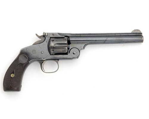 circa 1886, with blued round 6 1/2in. barrel, raised sighting rib signed 'SMITH & WESSON, SPRINGFIELD MASS USA' , the left side of barrel stamped '.44 S&W CTG', pinned crescent fore-sight with beaded top, standing adjustable blade rear-sight to the barrel-latch, fluted cylinder, break-open frame with automatic ejection, short ejector housing, chequered walnut grips and colour-hardened trigger-guard bow, the whole retaining much original finish