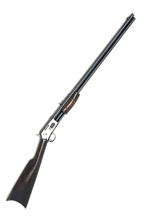 believed ex property of the San Francisco Police Department circa 1890, with re-finished round 26in. barrel, dove-tailed blade fore-sight, buckhorn rear-sight, the top of the barrel signed bt the manufacturer and with patent dates to 1887, bolt with attached dust cover, blued receiver with Colt's trademark, external colour hardened hammer, walnut butt-stock with crescent heel-plate, the lower tang with serial number erases and replaced with 'S.F.P. 69', walnut pump-handle and full length under-barrel magazine tube