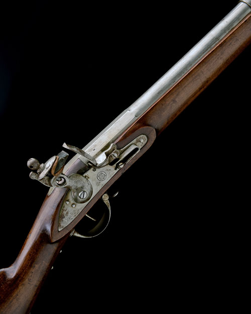 Belgian, circa 1800, with brushed bright round heavy 36in. barrel, octagonal breech-section with Belgian proofs, solid rounded top-tang, military-style lock stamped with a bumble-bee trade-mark with spread wings marked 'G' & 'L', brass pan, walnut three-quarter stock with iron furniture including finger-grooved lower tang, one barrel-band, nose-cap with applied brass boat-shaped fore-sight and iron ramrod