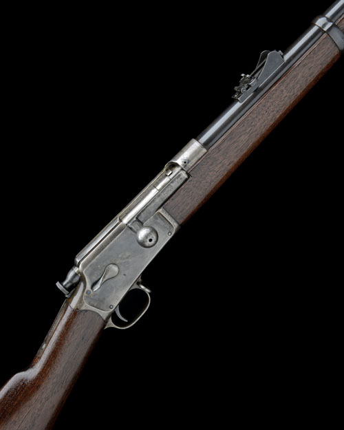 for 1893, with blued 28 1/2in. barrel, block and blade fore-sight, elevating ladder rear-sight, the top of barrel signed 'MANUFACTURED BY THE WINCHESTER REPEATING ARMS CO, NEW HAVEN CONN USA', colour hardened slab-sided receiver, tear-drop shaped safe to the right hand side, concealed magazine inside the butt, walnut butt-stock with iron heel-plate (some corrosion), trigger-guard tang with three lines of patents, walnut three-quarter fore-end with two blued barrel-bands and jag-ended under-barrel clearing-rod, much original finish throughout