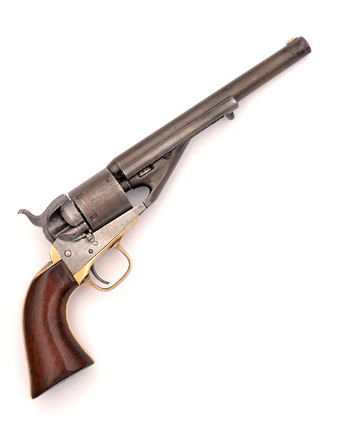 made circa 1864 and converted mid 1870's, with round 7 1/4in. barrel, traces of address to top, plain cylinder stamped '778' over '1442', open iron frame, the left side stamped with '1871' and '1872' patents, brass grip-straps, the heel stamped 'USN', smooth walnut one-piece grip, the left side marked with a large letter 'A' (possibly amateur) and stamped near the base 'D2' over 'CP' (inverted), the underside of barrel marked 'R.W.M', and a spring loaded ejector rod mounted to the right side of barrel