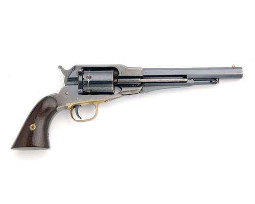 circa 1875, with blued octagonal 7 1/2in. barrel signed 'PATENTED SEPT 14 1858, E. REMINGTON & SONS, ILION NEWYORK USA, NEW MODEL', conical fore-sight, plain blued cylinder, blued solid frame with loading gate on the right hand side and thick applied recoil shield, brass trigger-guard, smooth walnut grips, hinged under-barrel rammer with sliding ejector rod, the whole retaining a strong amount of factory re-finish applied at conversion date