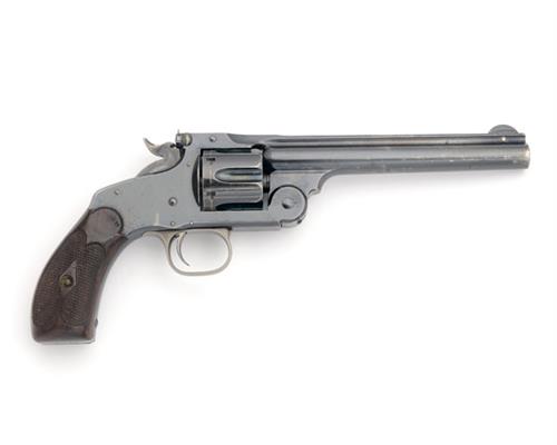 circa 1886, with blued round 6 1/2in. barrel, raised sighting rib signed 'SMITH & WESSON, SPRINGFIELD MASS USA' and with patent dates, the inscription ending in 'REISSUE JULY 25 1871', pinned crescent fore-sight, special order standing adjustable blade rear-sight to the barrel-latch, fluted cylinder, break-open frame with automatic ejection, short ejector housing, chequered walnut grips and colour-hardened trigger-guard bow, the whole retaining much original finish throughout