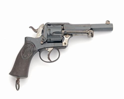 Belgian circa 1875 but styled on the French Officer's Model 1873, with stepped octagonal 4 3/4in. barrel, the underside marked 'ACIER FONDU', large dove-tailed fore-sight, sighting groove to the narrow top-strap, fluted cylinder, hinged loading gate, solid frame with hinged side-plate, chequered walnut grips with floral carving to tops, guarded trigger and under-barrel ejector, retaining much factory blued finish