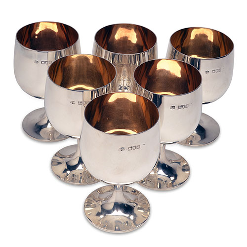 MAPPIN & WEBB A SET OF SIX SILVER & GILT WINE GOBLETS,