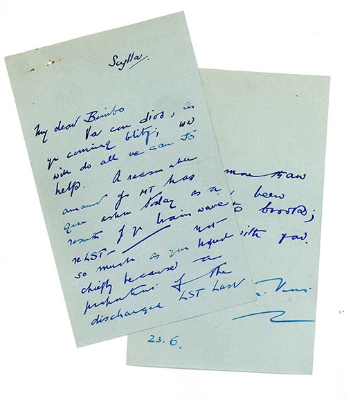 Other Notes: The letter, written on paper impressed with Scylla's crest, is mainly concerned with the fleet's embarkation of motor transport to the beaches (over 600 tanks alone were landed before the battle).