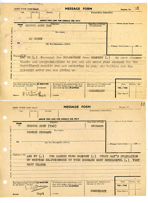 probably sent after the final battle for Caen, it reads, "First day's evacuation of British ex-prisoners by your command most successful. Very many thanks", together with a further signal to A.V.M. Sir Harry Broadhurst send during the Battle for Caen, "Personal for Broadhurst from Dempsey. My most sincere thanks and congratulations to you and all under your command for the magnificent results you are achieving in your air battles and the splendid cover you are giving us"