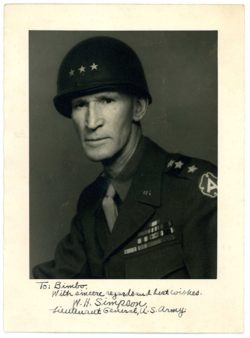 showing Simpson presenting Dempsey with an American flying jacket (see previous Lot) and a letter to Dempsey's Aide-de-Camp enclosing the images, together with a further image with hand-written dedication reading, "To: Bimbo, with sincere regards and best wishes, W.H. Simpson Lieutenant General, U-S Army"