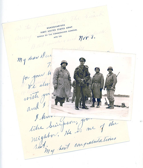 on First Army headed paper and dated 3rd November [1944], it reads, "My dear Dempsey, Thank you very much for your kind note. We always felt quite secure with you on our left flanks and I shall miss our visits. I know you are going to like Simpson [see previous Lot], your new neighbor [sic]. He is one of the best. My best congratulations on the fine work the Second Army is doing. Best wishes and best of luck. Sincerely, Courtney Hodges [p.s.] We must try to get together on the Rhine soon.", together with an images of the two men together on the banks of the River Rhine
