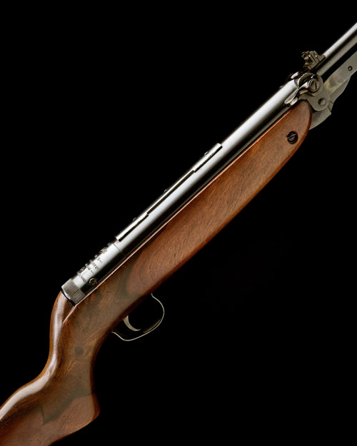 between 1961-1964, with blued tapering 18 1/2in. barrel, block and blade fore-sight, elevating blade rear-sight, plain air-chamber with applied 'dumbell' shaped telescopic sight rail, makers details to the trigger-unit, walnut half-stock and blued push-button under-lever, the whole retaining virtually all its original blued finish