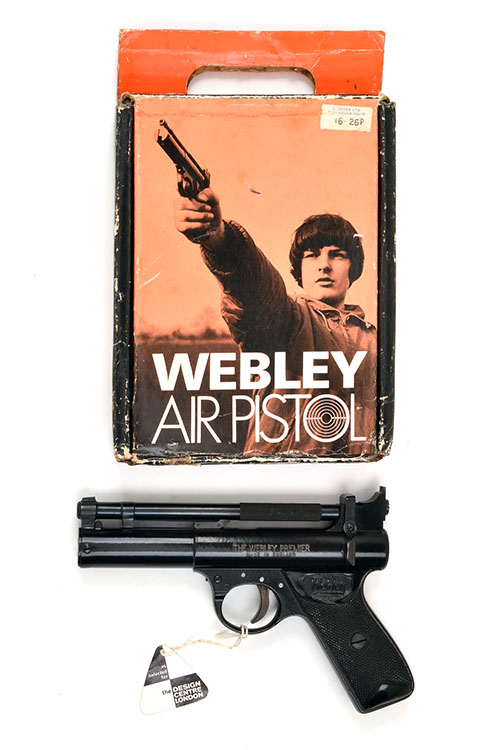 circa 1973, with blued 6 1/2in. barrel, adjustable rear-sight, stove-enamelled stepped air-chamber, the left side stamped 'THE WEBLEY PREMIER MADE IN ENGLAND', the right side plain, five pin trigger-group with additional locking trigger-adjuster (trigger-guard pins enamelled over), black chequered grips embossed 'WEBLEY', the pistol appearing unfired and retaining its 'DESIGN CENTRE LONDON' swing ticket; TOGETHER WITH its makers card carton with orange printed label to lid, instruction label loose inside and also containing a parts list with other instructional paperwork (light wear and damp spotting)