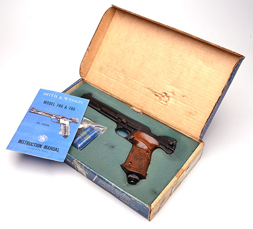 circa 1979, with black powder-coated 8 1/4in. barrel, blade fore-sight, adjustable rear-sight, non-adjustable trigger, hard brown plastic right-hand chequered grips, the whole in imitation of the same company's .22 rimfire Model 41 pistol and appearing little used; TOGETHER WITH its original card carton with foam inner-tray and retaining two original Smith & Wesson CO2 canisters, instruction leaflet and a small sample of pellets, box lightly worn