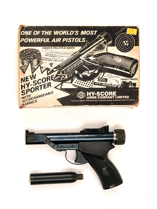 late production by 'HY-SCORE ARMS CO, KENT' circa 1985, with concealed 8in. interchangeable barrel, finely blued receiver railed for a telescopic sight, micro-adjustable rear-sight loading aperture mechanism at rear, plain blued frame and black plastic chequered grips, appearing little used TOGETHER WITH its 'HY-SCORE ARMS COMPANY LIMITED' card carton with thin card outer, spare barrel and a polished aluminium dummy sound moderator (currently covered in black tape)