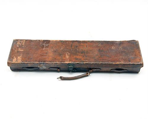 A SINGLE LEATHER GUNCASE, fitted for 31in. barrels, the interior lined with green baize, brass lock (key missing),
