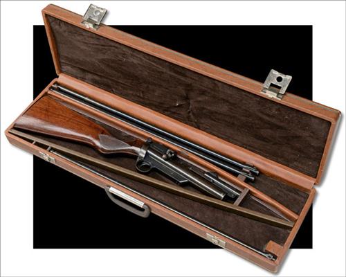 third series circa 1939, with blued 25 1/2in. sighted barrel numbered to the rifle (also stamped '986'), push-button barrel release, bolt handle locking catch, blued air-chamber with the make and model details to the left hand side and five lines of patents to the right, blued trigger-unit with no safety catch, walnut chequered saw-handled butt-stock, adjustable peep-sight, horn heel-plate, the whole sympathetically re-finished; TOGETHER WITH a .177 barrel numbered 4080 and a .22 barrel numbered 5063 for the same model also re-finished and a later take-down vinyl storage case fitted internally for the rifle with the three barrels detached