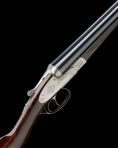 28in. nitro reproved barrels, 2 3/4in. chambers, bored approx. 1/4 and 1/2 choke, treble-grip action with hidden third bite, automatic safety, rounded bar, articulated front trigger (triggers set for the left hand), action and decorative sideplates finely engraved with beaded and floral borders with acanthus scrollwork, bright finish overall, 15 1/4in. figured stock cast on for the left shoulder, including 1in. rubber recoil pad, weight 6lb. 10oz., in a leather leg of mutton case