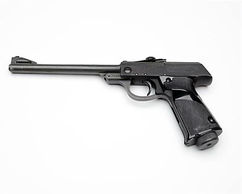 A .177 BARREL-COCKING AIR-PISTOL SIGNED WALTHER, MODEL 'LP53', serial no. 121402, circa 1978, with anodised 9in. barrel, (rear-sight incomplete), black crackle-finish receiver, black plastic chequered grips and much original finish