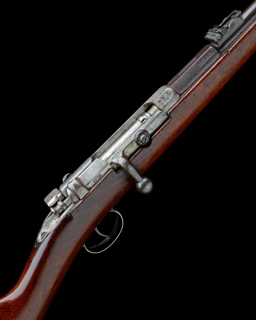 dated for 1876, and an Austrian produced licenced copy, with 20in. barrel, blade fore-sight integral with the nose-cap, two fore-sight protectors, elevating ladder rear-sight, the nocksform stamped 'OESTERR. WAFFFB. GES', octagonal receiver with further dare-stamp of '1877', matching number bolt with turned-down handle, flag safe to rear, walnut straight-hand full-stock with iron furniture, the heel-plate marked on the face '16 D 414G', fitted with a later webbing sling