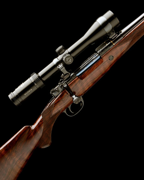 24 7/8in. nitro barrel gold-inlaid 'HARTMANN & WEISS . HAMBURG', block mounted open sights and matted ramp-mounted bead fore-sight with flip-up moonsight, the receiver (with thumb cutout) mounted with a Zeiss Varipoint 2,5-10x42 T* Victory telescopic sight in quickly-detachable mounts, the receiver ring with finely matted art deco panel and gold-inlaid with the calibre designation, fine acanthus scroll engraving and retaining virtually full blacked finish, engraved recoil blocks, triggerguard and trigger, hinged floorplate with push button release, the housing signed 'H.F.', highly-figured pistolgrip stock with cheekpiece, engraved steel pistolgrip-cap, sling swivels, 14 1/4in. pull including 3/4in. leather covered recoil pad