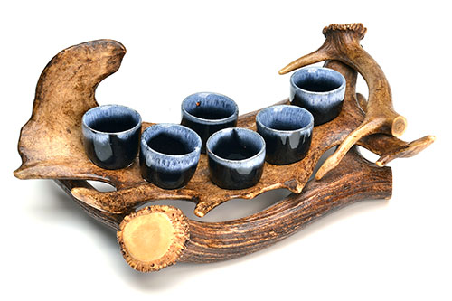 A SET OF SIX SHOT CUPS ON A FITTED FALLOW ANTLER TRAY, six dark and light blue ceramic shot cups, with fallow antler shaped, drilled and moulded to hold cups
