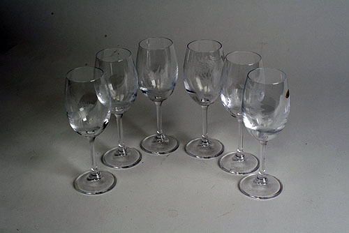 A SET OF SIX HUNTING SCENE ENGRAVED WINE GLASSES, (6)