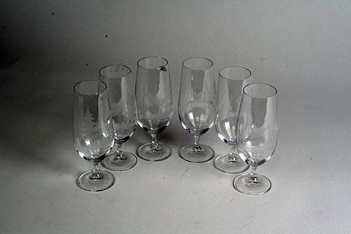A SET OF SIX HUNTING SCENE ENGRAVED BEER GLASSES, (6)