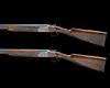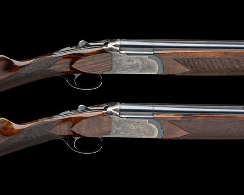 26in. nitro barrels, 7mm ventilated matt top-ribs gold-inlaid '1' and '2' at the breech ends, the over barrels engraved 'WILLIAM POWELL' in script, 2 3/4in. chambers, bored approx. imp. cyl. and 1/4 choke, Italian made actions with hold-open toplevers gold-inlaid '1' and '2', manual safeties, non-selective single triggers, No.1 engraved with acanthus scrollwork and game scenes, No.2 gun engraved with acanthus scrollwork and floral bouquets, retaining much original colour-hardening and finish, 14 3/4in. stocks including 1 1/8in. rubber recoil pads, weight 6lb. 8oz., in a double motor case