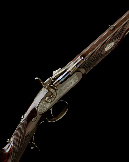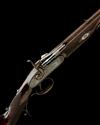 26in. octagonal bold twist barrel, converted from muzzle loading with F.E. Schneider and J. Snider patent hinged breech block, patent no. 1828 of 21st June 1862, bold scroll-engraved breech block inscribed 'HIGHET & HUNTER. AYR', open sights and bead fore-sight with protector, retaining underbarrel rod with brass tip with worm, non-rebounding bar action lock with high-spurred hammer, fine border and acanthus scroll engraving, the makers name engraved in a scrolling banner, the top tang with bold acanthus scrolls surrounding a small oval engraved with a stags head, triggerguard with a vignette of a running stag, engraved pineapple finial and chequered steel skeletal pistolgrip, the hand mounted with rear-sight mount bases, 14 1/4in. figured stock including steel buttplate, weight 4lb. 15oz.