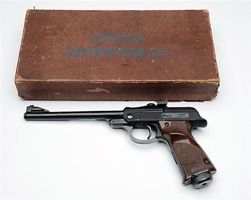 A BOXED .177 BARREL-COCKING AIR-PISTOL SIGNED WALTHER, MODEL 'LP53', serial no. 036263, circa 1962, with blacked 9 1/2in. barrel, black crackle finished receiver, brown chequered plastic grips, TOGETHER WITH its makers card carton with fore and rear-sight elements, box worn
