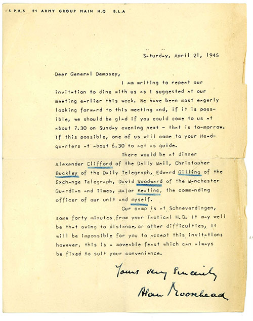 typed on 21st Army Group headed paper and dated 21st April 1945, the letter invites Dempsey to a dinner with Moorhead and other senior journalists in the field at his camp at Schneverdingen, signed in ink "Yours very sincerely Alan Moorhead"