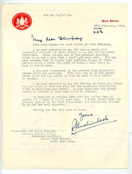 General Sir Richard O'Connor writes on Eastern Command headed paper dated 6th July 1945, "I must congratulate you on the wonderful finish, and I believe my old Corps had no small part in this", he continues in ink bringing Dempsey news of events in India during the final years of the Raj, together with a later letter to Dempsey, dated 26th February 1946 from Field Marshal Sir Claude Auchinleck on his Commander in Chief of India headed paper in which he writes his thanks for Dempsey's assistance in matters of personnel