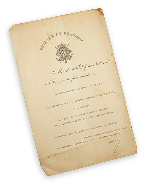 on headed paper of the Belgian Minister of Defence, and bearing his seal it reads (translated): The Minister of the National Army has the honour to announce to Lt.-Col. Sir Miles C. Dempsey that according to the decision of the Prince Regent, on the 26th October 1945 he has been declared Great Officer of Leopold Award with Palm, and has received The War Cross 1940 with Palm due to the great services given to Belgium. He is pleased to send him his sincere congratulations for this award."