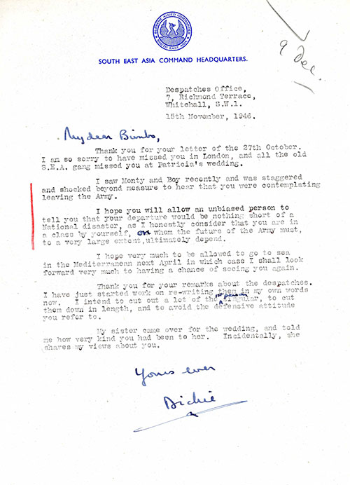 written in the tumultuous period before Indian independence and on headed paper from both S.E.A.C. headquarters (South East Asia Command) and Mountbatten's Broadlands estate, the letters illustrate a growing friendship between the two men and are concerned with various topics such as Dempsey succeeding Viscount Slim in the 14th Army and the wish that Dempsey should then replace Montgomery following his impending retirement as C.I.G.S., in one letter upon hearing of Dempsey's intention to leave the army Mountbatten writes, "I hope you will allow an unbiased person to tell you that your departure would be nothing short of a national disaster, as I honestly consider that you are in a class by yourself, on whom the future of the Army must, to a very large extent, ultimately depend."
