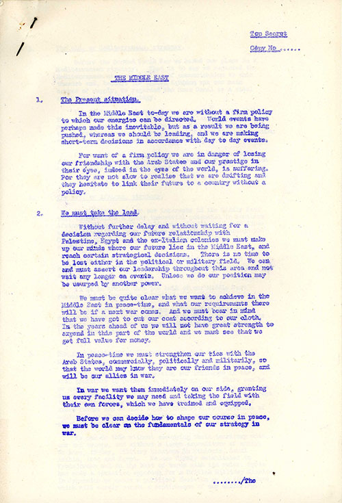 dated June 1947 and running to eight pages of Foolscap, in which Dempsey pushes for a far greater sense of direction and protection of our own interests, he closes by saying, "The machine is awaiting the word, but each day that passes makes the execution of the plan more difficult and more costly. Directly the word is given, a load of uncertainty will be removed and we can set about our business in the knowledge that we are working to a goal decided by ourselves in our own interests. And we will find that many of the obstacles in the way of a satisfactory solution in the Middle East will collapse in front of us."