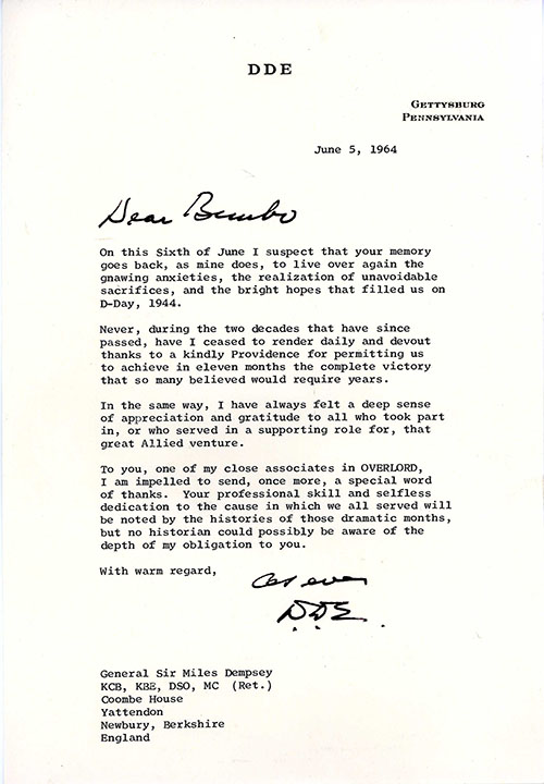 written on his personal headed paper, it begins, "Dear Bimbo, On this sixth (sic) of June I suspect that your memory goes back, as mine does, to live over again the gnawing anxieties, the realization of unavoidable sacrifices, and the bright hopes that filled us on D-Day, 1944. (para) Never, during the two decades that have since passed, have I ceased to render daily and devout thanks to a kindly Providence for permitting us to achieve in eleven months the complete victory that so many believed would require years." He ends saying , "But no historian could possibly be aware of the depth of my obligation to you. With warm regard, as ever D.D.E."