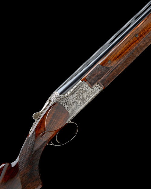 27 5/8in. (70cm) nitro barrels with 12mm ventilated matt top-rib, moon bead foresight and intermediate beadsight, 2 3/4in. chambers, bored approx. imp. cyl. and 1/4 choke, three-piece semi-beavertail fore-end, hold-open toplever, manual safety with integral barrel selector switch, bold acanthus scroll engraving surrounding game scenes of pheasant and duck, signed 'J. BAERTEN', the underside of the action bar marked 'D4G', silver finish, 14 3/4in. well-figured pistolgrip stock, weight 7lb. 8oz.