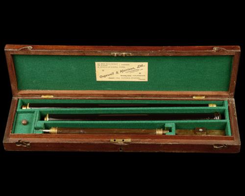 circa 1890, with 19in. barrel section (36 1/4in. overall), the outer body with open-sights and concealed button trigger, detachable brass nose-ferrule with captive mahogany ramrod, multi-groove brass rifled barrel, plain air-reservoir, the valve signed 'COGSWELL & HARRISON LONDON', horn mushroom pommel, the whole restored and re-painted black; TOGETHER WITH its re-lined and restored walnut case, re-lined in green baize, reproduction trade-label to the inside of lid and complete with pump (foot-plate renewed) and scissors ball-mould (no cocking key), the air-cane retaining its rare brass screw-on valve dust-covers for when in storage