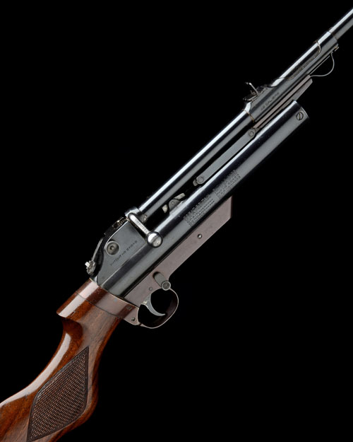 early type circa 1935, with blued detachable matching number barrel held by a flat-spring, the barrel stamped '.22 CALIBRE' below the rear-sight, turned-down bolt handle barrel lock, blued air-chamber marked 'WEBLEY SERVICE AIR RIFLE MKII' on the left and five lines of patents on the right, trigger unit with side safety, back of receiver with 'L' shaped folding peep-sight, walnut butt-stock with chequered saw-handled grip, grooved hard-rubber heel-plate, the whole retaining virtually all its original finish (trigger unit turning 'purple')