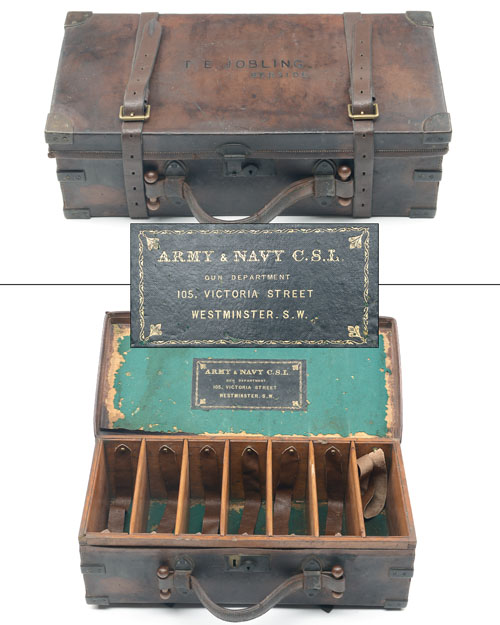 for approx. 500 cartridges, the interior lid lined with green baize (moth damaged), a leather gold tooled Army & Navy trade label, oak body, six oak removable dividers, seven replacement leather lifters, brass lock (key missing), the lid exterior with 'T.E. JOBLING, BEBSIDE'