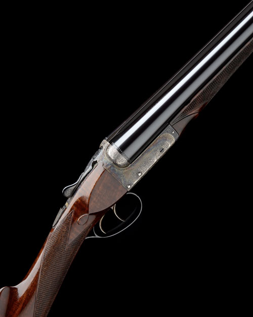 28in. nitro barrels with Churchill rib, the tubes engraved 'WEBLEY & SCOTT. BIRMINGHAM.', 2 3/4in. chambers, bored approx. imp. cyl. and 1/4 choke, right wall thickness below recommended minimum, sculpted toplever, automatic safety with gold-inlaid 'SAFE' detail, fine acanthus scroll engraving with scroll and leaf bordering, retaining much colour-hardening and finish, 14 3/4in. highly-figured stock, bolstered fore-end, weight 6lb. 4oz., in a canvas and leather case